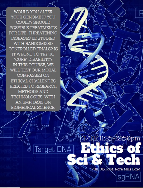 University course description: Ethical dilemmas in the practice of health care continue to proliferate and receive increasing attention from members of the health care profession, ethicists, policy makers, and the general public as health care consumers. In this course we will examine a number of ethical issues that arise in the context of contemporary medical practice and research by analyzing articles and decision scenarios. Topics to be covered typically include the physician-patient relationship; informed consent; medical experimentation; termination of treatment; genetics; reproductive technologies; euthanasia; resource allocation; and health care reform. Students who successfully complete this course will be able to identify and analyze different philosophical approaches to selected issues in medical ethics; have gained insight into how to read and critically interpret philosophical arguments; and have developed skills that will enable them to think clearly about ethical questions as future or current health care providers, policy makers, and consumers. This course is part of a core sequence leading to Certification in the Conceptual Foundations of Medicine Certificate Program, and is a companion course to HPS 0612 (Mind and Medicine) but may be taken independently. The course is of particular interest to pre-medical and pre-health care students. |