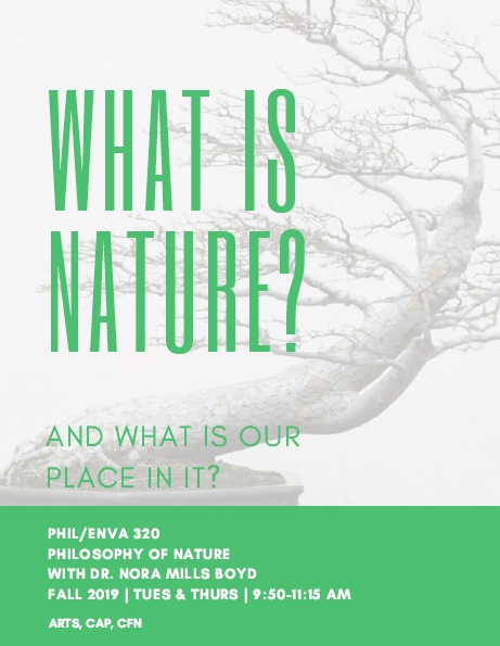 Course description:What is nature? And what is our place in it? We will take a long view on these questions, engaging with figures from Lucretius to Alexander von Humboldt to cutting-edge contemporary thinkers and activists. Along the way, we will analyze several important and notoriously tricky conceptual loci such as naturalness, wilderness, dominion, stewardship, the artificial, and the Anthropocene. Since our focus will be on humanity's relationship to the cosmos, this course will culminate in a final project where we create our own versions of the Voyager spacecraft golden records. Initial Course Syllabus, PHIL 320 Fall 2019 before class councils [pdf] Final Course Syllabus, PHIL 320 Fall 2019 after class councils [pdf] |