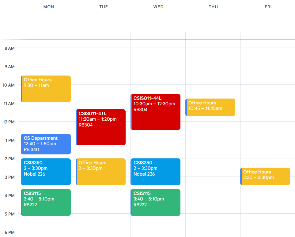 Office Hours (in office and Zoom), Fall 2025 Semester (2 Sep - 8 Dec): Monday 9:30 - 11, Tuesday 2 - 3:30, Thursday 10:45 - 11:45, Friday 2:30 - 3:30, and by appointmentComplete Schedule: